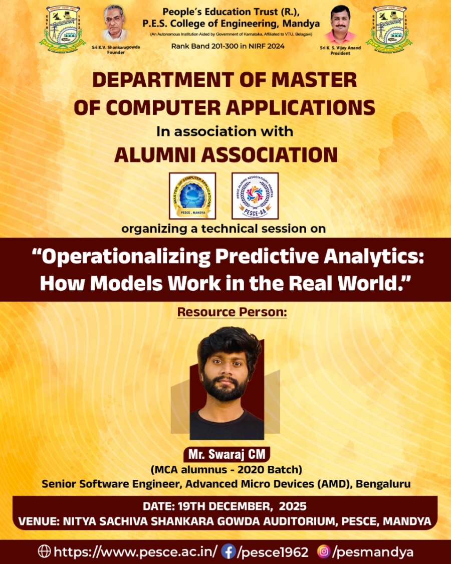 The Department of Master of Computer Applications (MCA) at PES College of Engineering, Mandya, was established in 1992 and is recognized as one of the earliest departments in Karnataka to introduce a postgraduate program in Computer Applications. The department offers a Master of Computer Applications (MCA) program, thoughtfully designed to build a strong foundation in core computer science principles and modern software practices.