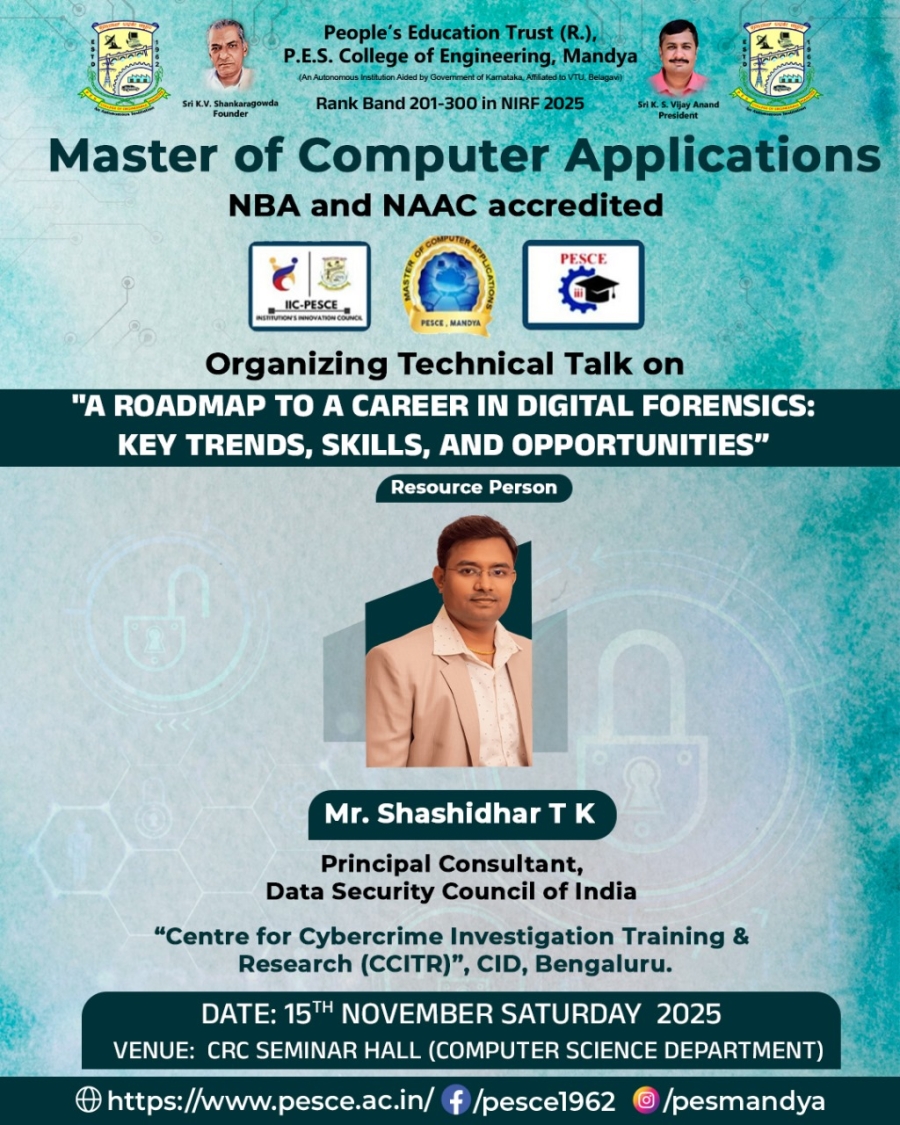 The Department of Master of Computer Applications (MCA) at PES College of Engineering, Mandya, was established in 1992 and is recognized as one of the earliest departments in Karnataka to introduce a postgraduate program in Computer Applications. The department offers a Master of Computer Applications (MCA) program, thoughtfully designed to build a strong foundation in core computer science principles and modern software practices.